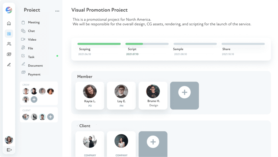 私たちのプラットフォームは、SaaSとして社内プロジェクトやプロダクションの進捗管理を可能にし、同時に、才能あるCREWとのコミュニケーションやアウトソーシングを効率的に実現します。
